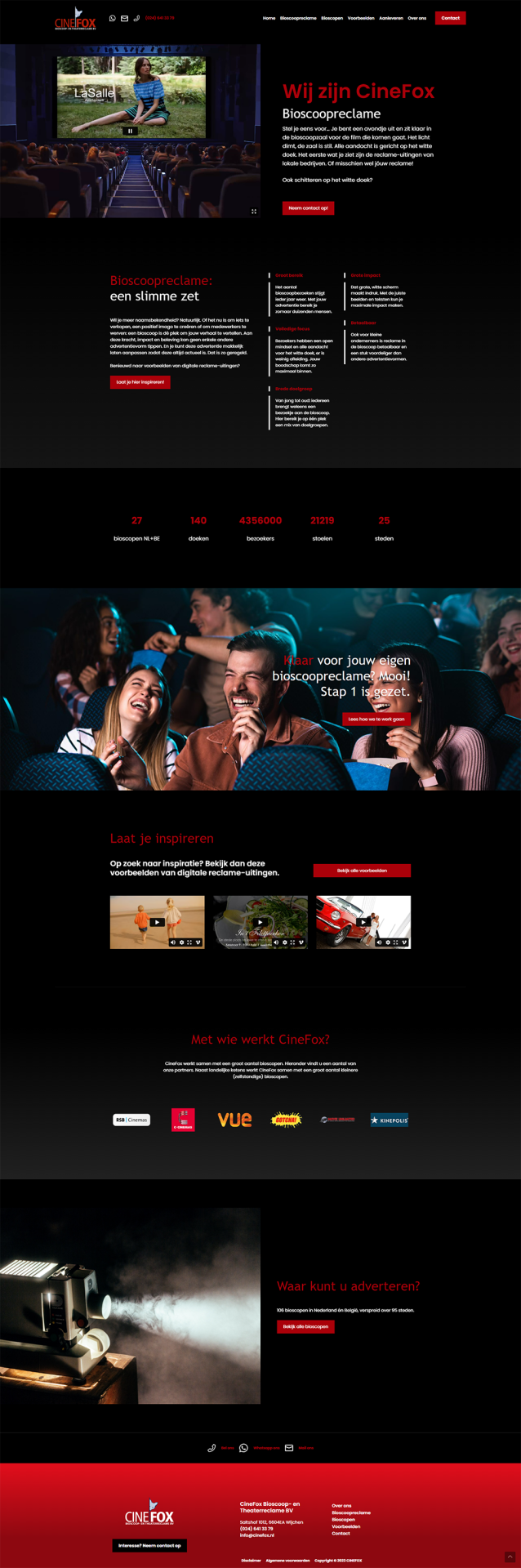 De oude website van CineFox was aan vernieuwing toe. De vraag was om meer gevoel en beleving in de website te leggen. Dit hebben we kracht bijgezet door extra beweging in de website te brengen, aangezien die mooi aansluit bij het product van CineFox. Ook hebben we voor zwart als basiskleur gekozen, dit geeft de bioscoopbeleving. We hebben gezorgd dat bezoekers kunnen zien hoe hun bioscoopreclame er uit zou kunnen zien. Hiervoor hebben we een pagina met voorbeeldfilmpjes gemaakt. Daarnaast is er een duidelijke uitleg van hoe CineFox te werk gaat als je via hun bioscoopreclame gaat maken. Ook is er een interactieve kaart ingebouwd, waar alle locaties van bioscopen op staan waar CineFox reclames kan laten tonen. De teksten zijn door onze tekstschrijver geschreven. Nadat de Nederlandse website online is gegaan, hebben we verder gewerkt aan de Vlaamse website, want ook in België zit een vestiging van CineFox. Bekijk de Vlaamse Cinefox website hier.