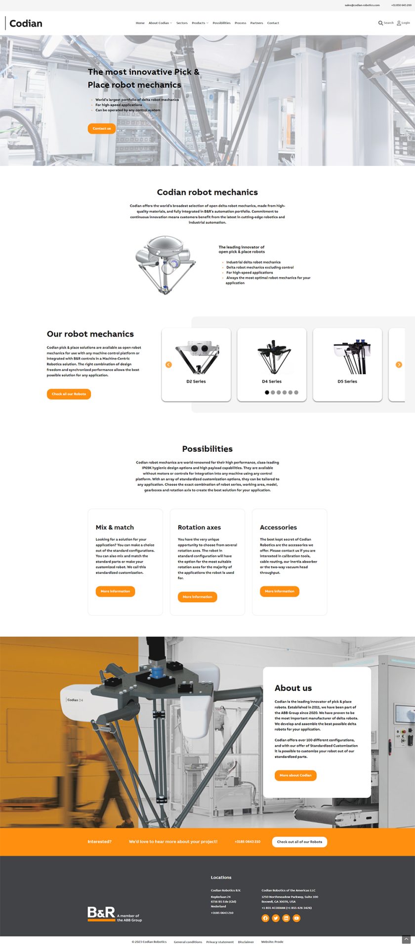 In 2019 hebben we een nieuwe website voor Codian Robotics mogen maken. De jaren erna hebben we de website technisch in orde gehouden en wijzigingen doorgevoerd. In 2023 is het bedrijf overgenomen en kwam er een duidelijkere focus op het product op de website. We hebben een nieuw ontwerp gemaakt waarin de producten groot in beeld staan. Voor in de toekomst is er de wens nog meer interactie in de website aan te brengen. Ook hebben we het filter anders ingericht. Al met al is het een mooie lichte website geworden waarin de bezoeker een duidelijk beeld krijgt van de producten. In eerste instantie is de website in de Engelse taal online gezet, later zullen we meerdere talen toevoegen.