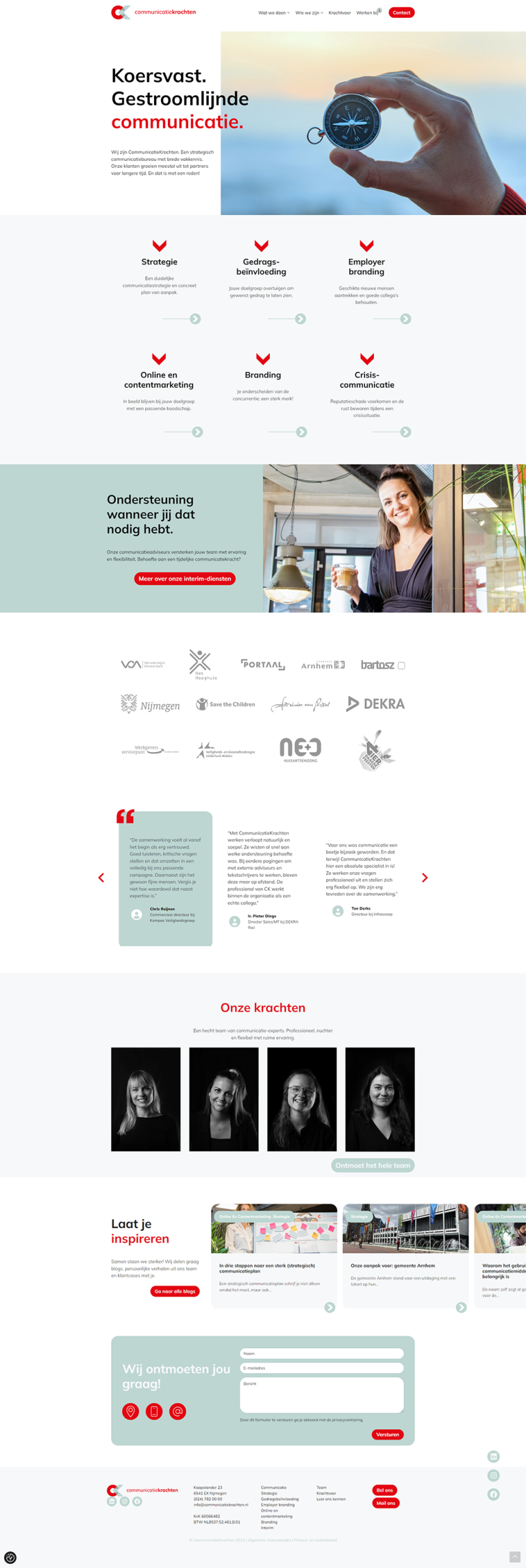 CommunicatieKrachten is een communicatiebureau in Nijmegen. De diensten die ze hun klanten leveren variëren van strategie en branding tot crisiscommunicatie. CommunicatieKrachten heeft een vast team met brede vakkennis. Het team ondersteunt hun klanten op hoog niveau en met veel creativiteit. Voor diverse projecten hebben wij al samengewerkt met CommunicatieKrachten. Nu was hun eigen website toe aan een nieuwe vormgeving en systeem en Wij mochten de website bouwen!