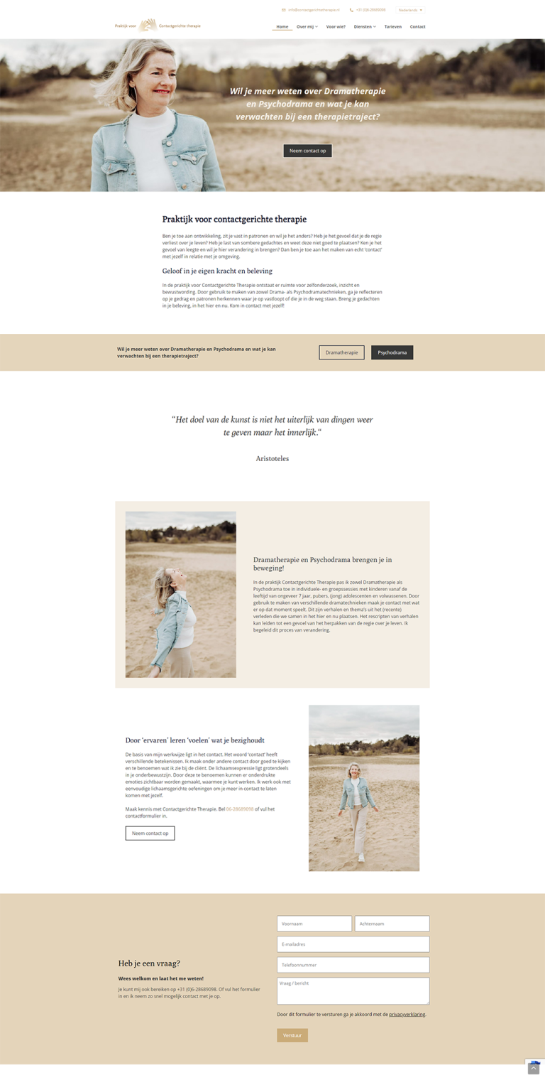 De website van Contactgerichte Therapie was aan vernieuwing toe omdat het systeem verouderd was. We hebben een ontwerp voor de website gemaakt en zijn van daaruit gaan bouwen. We hebben de website licht van kleur gehouden. Samen met de foto’s, die speciaal voor de website gemaakt zijn, wordt de sfeer goed neergezet. Het is een basic plus website, het is een relatief eenvoudige website, zonder ingewikkelde systemen. De klant had de wens om de website ook in het Duits te hebben, aangezien haar doelgroep ook uit Duitsland kan komen. Eerst hebben we de Nederlandse website helemaal gemaakt, waardoor we de basis voor de Duitse website hadden. Hierdoor konden we de Duitse vertaling snel maken.