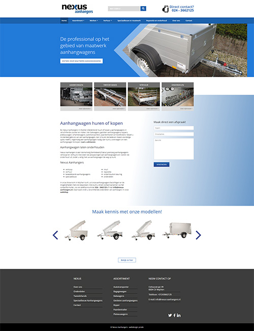 Voor Nexus aanhangers hebben we een frisse nieuwe website mogen maken. De wens van de klant was om de bezoekers van zijn site de aanhangers te laten zien in een soort webshop. Maar omdat een aanhanger geen pakje boter is, is er voor gekozen om geen de webshop als een catalogus in te richten. Geïnteresseerden kunnen zelf contact opnemen of aan geven dat ze het prettig vinden als Nexus aanhangers contact opneemt. De shop heeft een filter zodat bezoekers kunnen filteren op merk, type, categorie, gewicht en prijsklasse. Ook de aanhangers die te huur zijn worden per soort aanhanger met foto’s en informatie toegelicht. Het menu is zo ingedeeld dat de bezoeker snel op de pagina terecht komt waar hij moet zijn. De teksten zijn door onze tekstschrijvers geschreven en de pagina’s zijn door ons geoptimaliseerd, zodat de website in zijn geheel zo goed mogelijk vindbaar is via de zoekmachines.