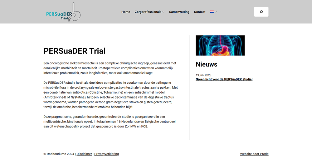 De website van PERSuaDER Trial is een eenvoudige website, bestaand uit enkele pagina’s en nieuwsberichten. Er is geen ontwerp voor deze website gemaakt, aangezien hij puur informatief is. Op de website is informatie te vinden over de studie en zorgprofessionals kunnen er documenten downloaden. Via de contact pagina kan er contact opgenomen worden met de coördinatoren van het onderzoek. De website is tweetalig; Nederlands en Engels. We vinden het fijn dat we deze website hebben mogen maken en hopen dat het onderzoek een mooie uitkomst heeft.