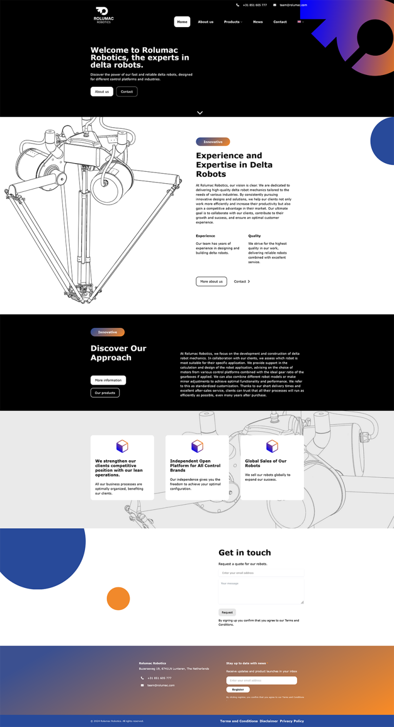 De website heeft als doel informatieve te geven aan de bezoekers. In eerste instantie zijn we uitgegaan van een wireframe en de huisstijl die onze klant aangeleverd heeft. Aangezien dat niet het gewenste resultaat opleverde hebben we in samenspraak met de klant toch een ontwerp voor de website gemaakt. Na akkoord op het ontwerp zijn we de website opnieuw op gaan bouwen. De website bestaat uit enkele pagina’s en de product pagina’s. Rolumac is bezig met het ontwikkelen van nieuwe series delta robots. Wanneer deze beschikbaar zijn, kunnen deze eenvoudig via de website toegevoegd worden. Bezoekers kunnen middels het filter de juiste serie robots bekijken. Het is een twee talige website geworden, met als basis de Engelstalige website. De website wordt door Prode Hosting technisch up to date gehouden en wanneer de klant een aanpassing of toevoeging voor de website heeft, zorgen we dat deze uitgevoerd wordt.