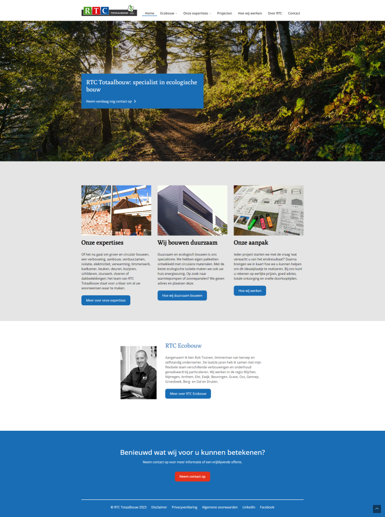 Het ontwerp van de website is door Rob aangeleverd. Alle informatie over Ecologisch bouwen en de expertises zijn overzichtelijk geplaatst en eenvoudig via het menu te vinden. Op de pagina Projecten kunnen de projecten op categorie gefilterd worden door de bezoeker. De projecten blijven we in de toekomst aanvullen, zodat de website up to date blijft. Daarnaast blijven we regelmatig geoptimaliseerde teksten schrijven om de vindbaarheid van de website te blijven verbeteren. Natuurlijk zorgen we er ook voor dat de website technisch onderhouden wordt en snel geladen wordt. Al deze factoren dragen bij aan een goede vindbaarheid en een fijne gebruikerservaring.