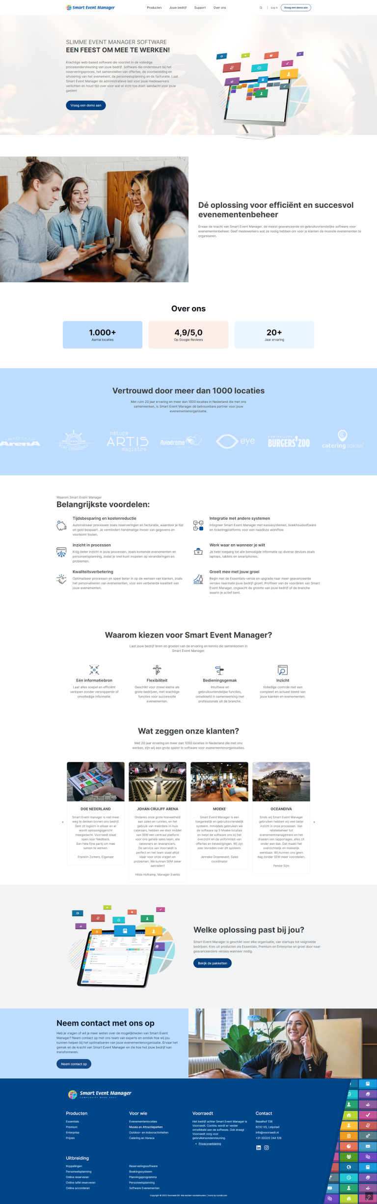 De website van Smart Event Manager was in een systeem gebouwd dat minder toegankelijk is dan WordPress. Daarbij mocht de website ook wel een vernieuwde frisse uitstraling krijgen. De teksten zijn door een tekstbureau geschreven op basis van input vanuit ons voor de structuur. De website is vooral bedoeld om informatie te geven aan de bezoekers en eventuele opdrachtgevers. We hebben het menu onderverdeeld in de producten met daaronder de functionaliteiten, koppelingen en pakketten. De bezoekers kunnen op die pagina’s de functies en mogelijkheden ontdekken. Voor het gemak is er ook een onderverdeling gemaakt in branche, functie en bedrijfsgrootte. Zodat snel duidelijk wordt wat Smart Event Manager voor een bepaald bedrijf kan betekenen. Door de hele site heen hebben we gewerkt met de kleuren uit het logo. De kleuren komen bijvoorbeeld terug in icoontjes, als achtergrond van screenshots en als lichtere variant in achtergronden om tekst uit te lichten. Hierdoor is het een mooi geheel geworden. We zullen de website technisch in orde houden, zodat hij nog jaren mee kan.