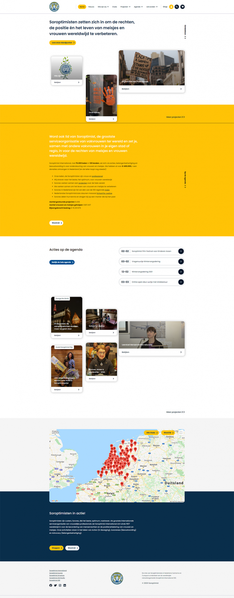 De website van Soroptimist Nederland was aan vervanging toe, zowel op het gebied van design als technisch. Aangezien er ook producten te koop zijn, hebben we een Webshop aan de site toegevoegd. Om alle interne verslagen, folders, PR materiaal centraal te hebben staan hebben we een intranet gebouwd. De leden van de Clubs kunnen hierop inloggen voor nieuws en informatie. Elke Club heeft een eigen mini-website binnen de website gekregen. Hier kan de club zelf nieuwe projecten, acties of nieuws toevoegen. Daarbij hebben we gezorgd voor één en dezelfde uitstraling in de Club websites. Weer een heel tof project om te maken, stiekem zijn we er erg trots op!